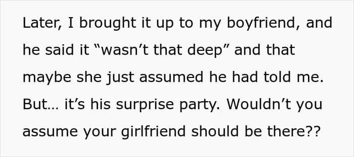 A woman asked the internet if she was wrong to show up uninvited and unannounced to the surprise birthday party her boyfriend’s “girl best friend” put together. We reached out to her via private message and will update the article when she gets back to us.