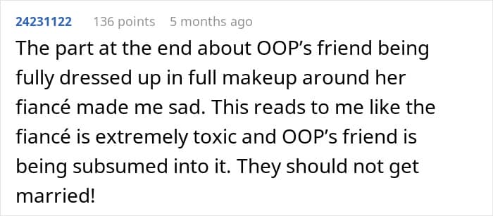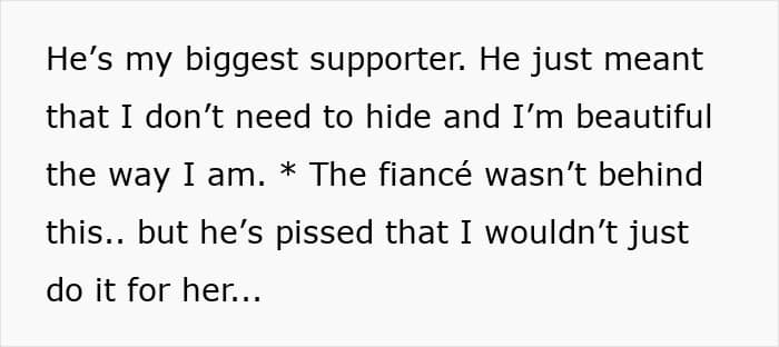 The OP was shocked, to say the least. To be clear, she never expressed insecurity and a desire to change. She was confident in her own skin, and honestly, good for her. But suddenly, she was being treated like a fixer-upper project. So, the OP declined the maid of honor role, because she’s not a prop, she’s human.