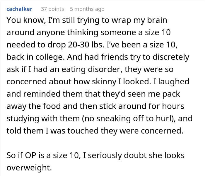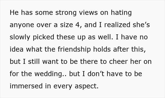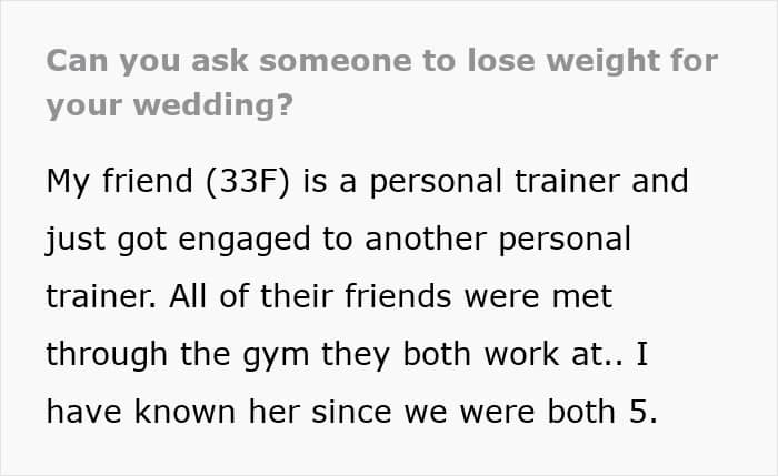 The OP (original poster) had been besties with the bride since they were 5. The bride and her fiancé are both gym rats with shaker bottles for emotional support. The OP, however, is a proud mom of three, rocking a US size 10 like the queen she is, living a happy, healthy life. No body issues, no complaints, just doing her thing, with a clean bill of health from her doc.