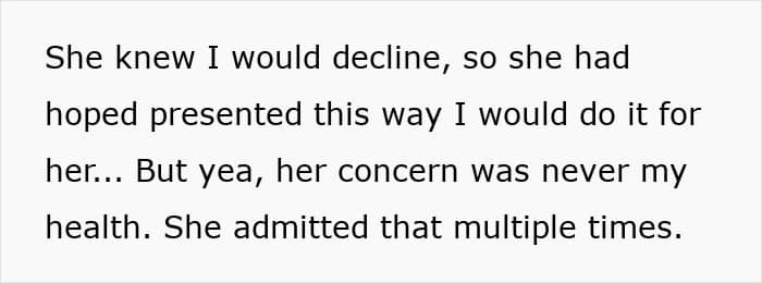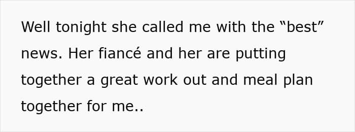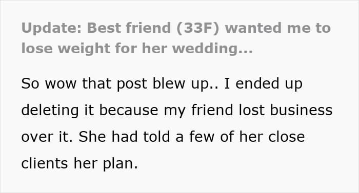 So, when the bride rang her up, giddy with “exciting” wedding updates, the OP probably expected a chat about flowers or seating charts. Instead, she got hit with a surprise fitness plan designed to help her lose 30 pounds before the wedding. And all because she didn’t fit into the bride’s Instagram aesthetic. Apparently, if she dropped some pounds, their wedding pics would be more “symmetrical.”