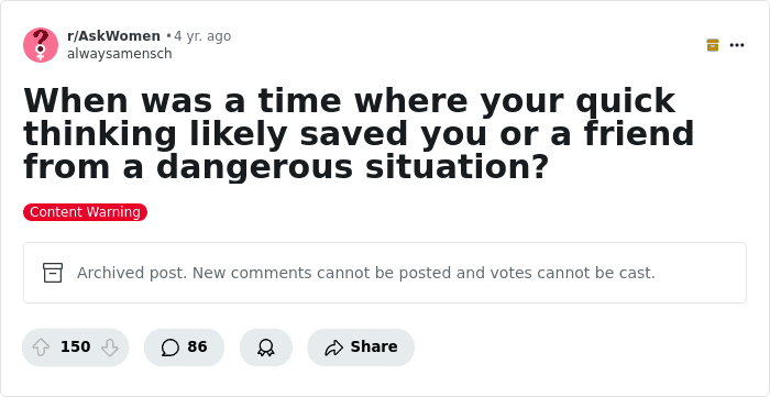 Someone asked “When was a time where your quick thinking likely saved you or a friend from a dangerous situation?” and people shared their stories. So get comfortable as you scroll through, upvote your favorites and be sure to add your own stories in the comments section down below.
