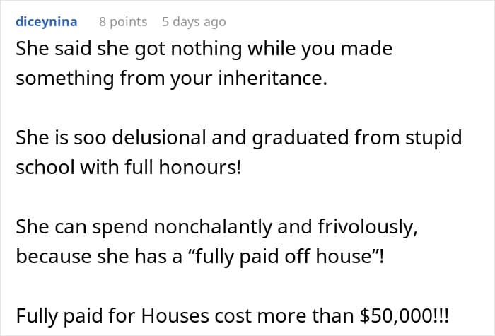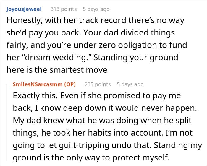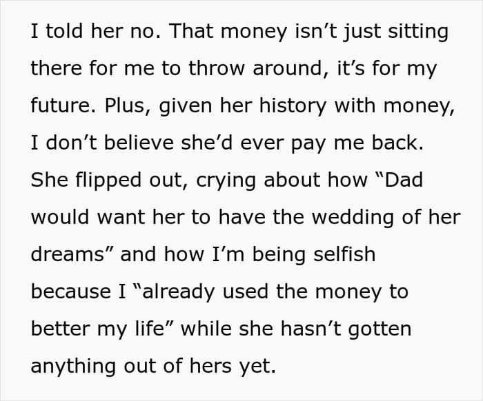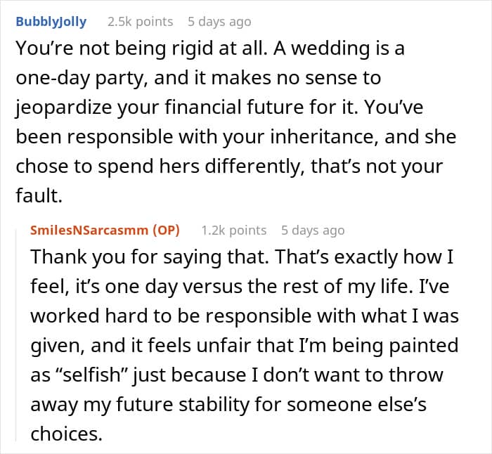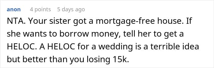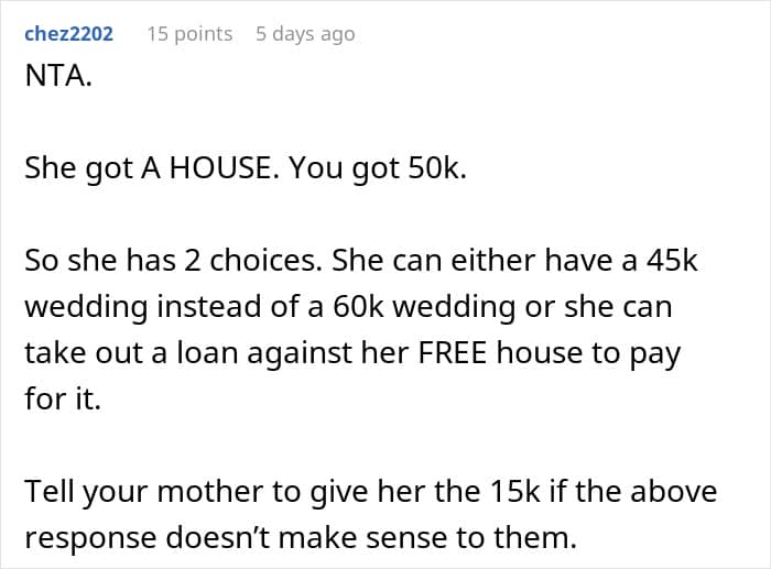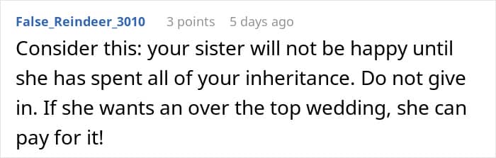 RELATED:A woman was asked to fund her sister’s wedding by adding $15k from her inheritance