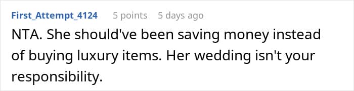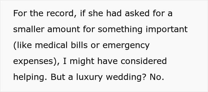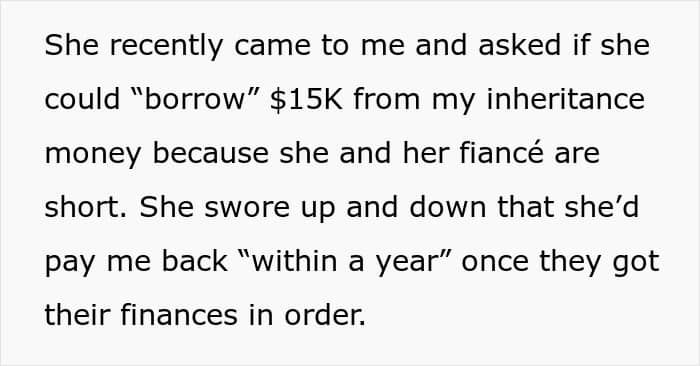 This bride was planning a wedding that was a bit more expensive – $60k. How was she going to pay for it? By borrowing $15k from her sister’s inheritance, of course! However, it turned out to be hard to persuade the sister, since she wasn’t keen on the idea of lending $15k for a party. To find out if she’s being too rigid, the sister turned to the Internet and asked people for their unbiased opinions.