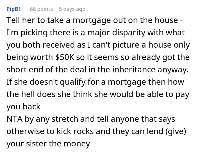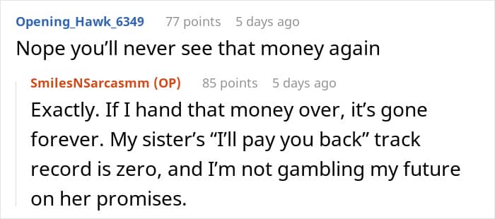 The woman didn’t want to lend the money because of the sister’s poor track record with money