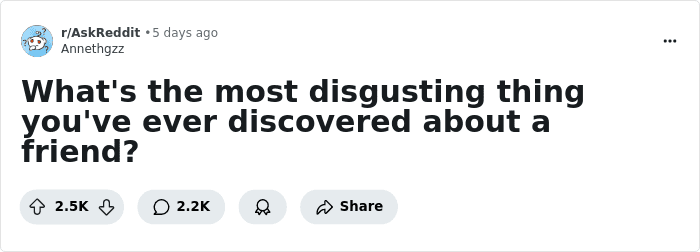 But when does questionable behavior go way too far? Redditors have recently been recalling the nastiest things they’ve ever discovered about their friends, so we’ve gathered their most repulsive replies below. From living in squalor to exhibiting atrocious behavior, some people seem to have absolutely no shame and zero regard for sanitation. We recommend that you don’t read this list while eating lunch, pandas, and be sure to upvote the tales that thoroughly gross you out!
