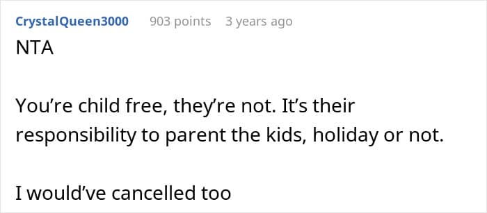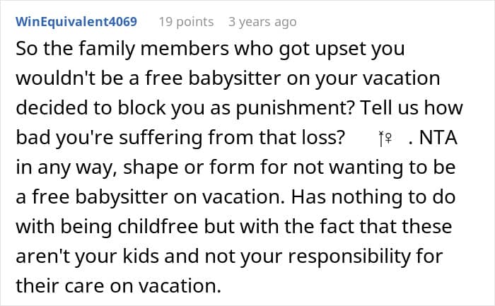 Now, our OP is childfree, which by the way, is a lifestyle, not a job title. She was totally fine helping out for an evening or two, but giving up her beach cocktails and spa naps for 2 weeks of unpaid daycare? Yeah, no thanks. And when she refused, things got icy fast. Suddenly, she was selfish, heartless, and ironically, childish.