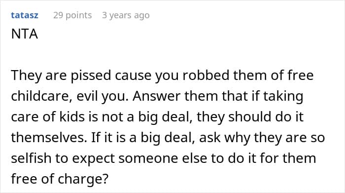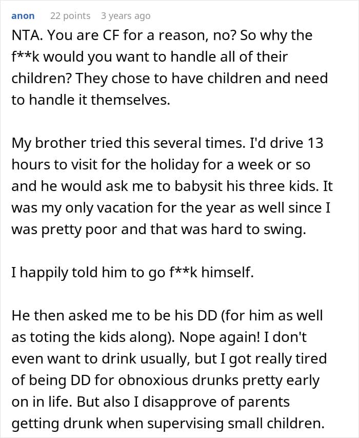Your best move? Don’t play along. When someone tries to hand you a responsibility you never wanted, just toss it back. But be aware that they probably won’t give up so easily. They’ll try to guilt-trip you and make you feel bad for saying no. Just like the OP got branded “selfish” for not wanting to be the family babysitter.