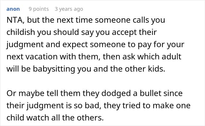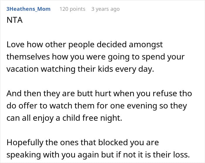 Right before the vacation, the OP discovered that some family members had decided she was the designated babysitter. The plan? They’d dump the kids on her every morning, disappear for “grown-up fun,” and reappear right before dinner, looking suspiciously well-rested.