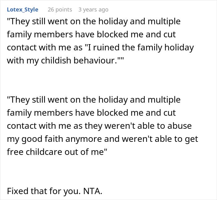 Her relatives started a whole guilt-trip parade, so the OP ended up canceling her vacation, because two weeks of family drama and toddler tantrums wasn’t her idea of relaxation. But the family went without her, and apparently, refusing unpaid childcare “ruined” the holiday. Not the scheming or the entitlement. Nope, it was OP’s fault.