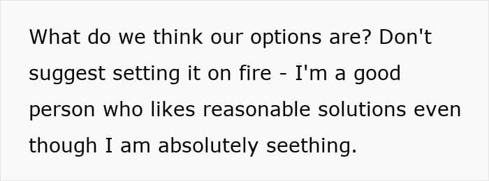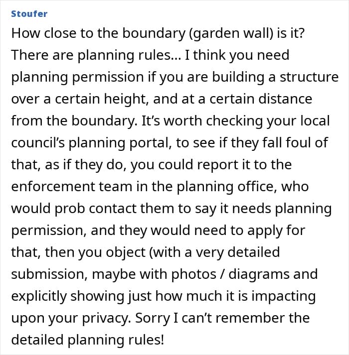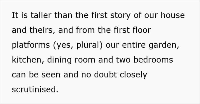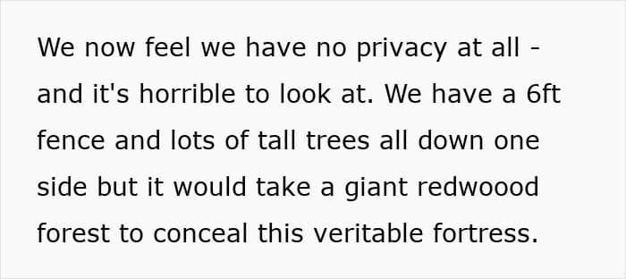 To the OP, this felt like an invasion of her family’s daily life. However, she noted that the massive wooden construction wasn’t cheap. With a price tag of around £10,000 and a 15-year guarantee, this isn’t something that’s going to quietly rot away anytime soon, and while she had already ruled out destructive revenge, she was now searching for solutions.