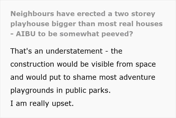 According to the OP, her neighbor built a play structure that stood well over three meters tall – that’s about the height of a double-decker bus. However, this meant that from its lofty platforms, the neighbor’s children now had sweeping views into her garden, kitchen, dining room, and even bedrooms.
