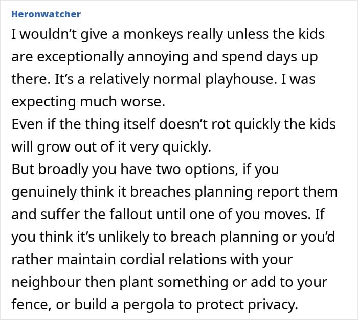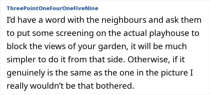 Netizens felt the towering playhouse wasn’t worth too much stress. They pointed out that kids often lose interest in such structures quickly, so it might be a matter of waiting for the novelty to fade. Others suggested practical fixes like adding a trellis or simply asking the neighbors for screening to block direct views.