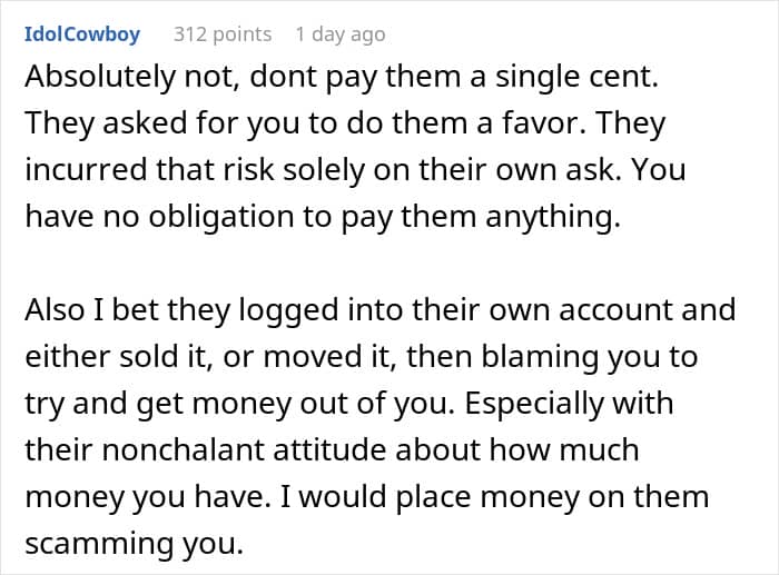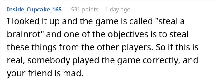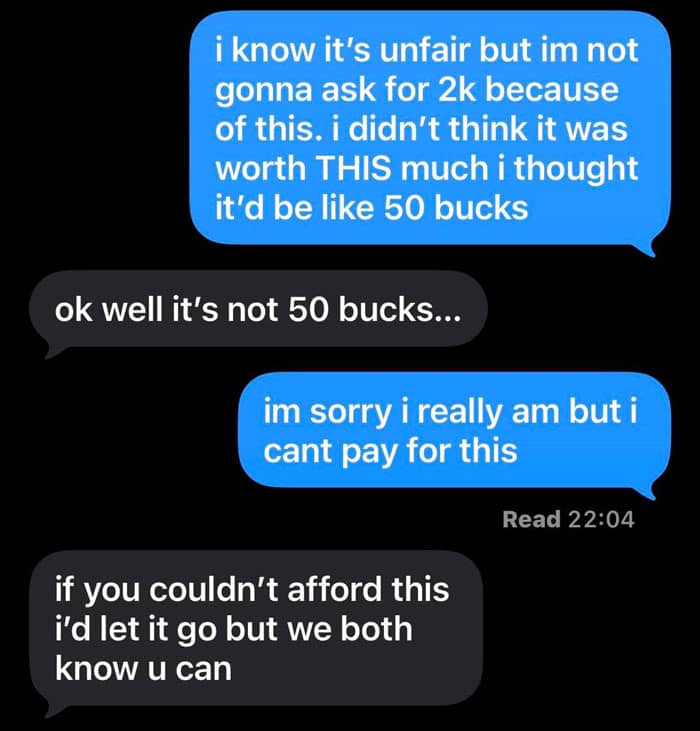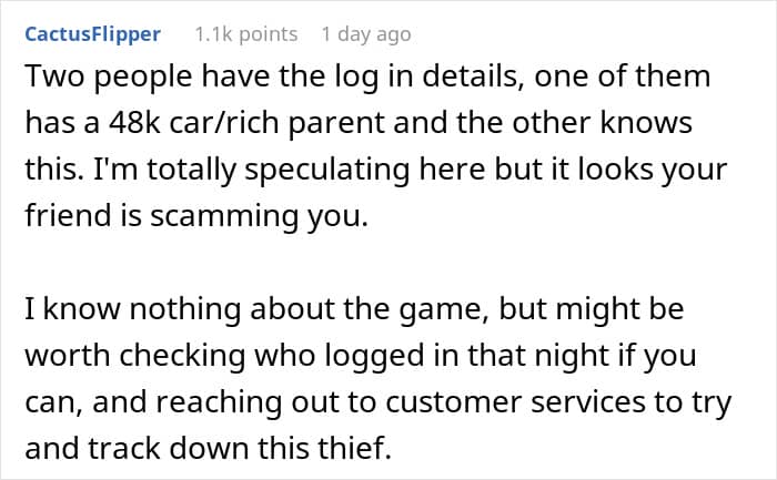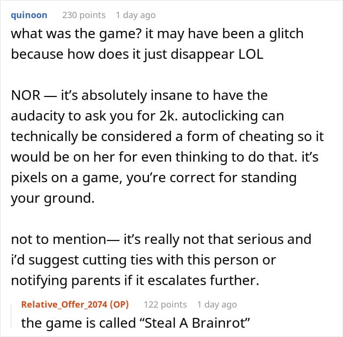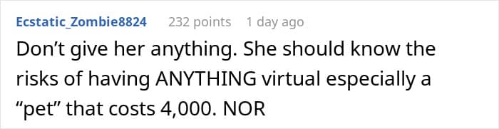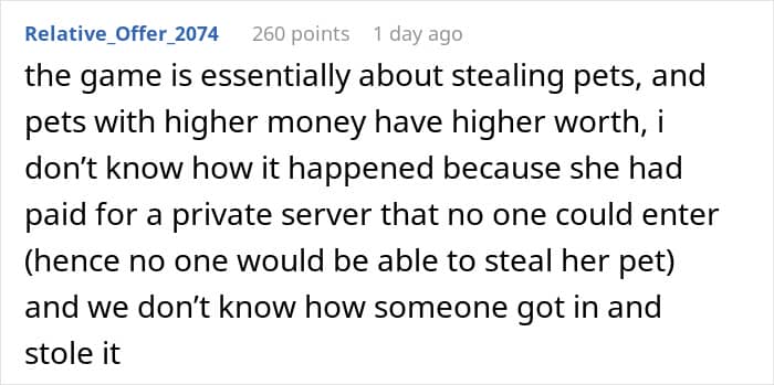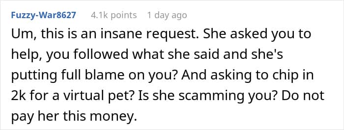 It’s worth keeping that they were supposedly on a private server, where no one else should have been able to steal the pet. The friend later changed her mind and decided she wanted to buy the pixelated pet instead, claiming it was worth $4,000. Obviously, no 17-year-old can afford that. Still, the friend insisted that the OP should be the one to pay, arguing that she could afford it simply because she owned an expensive car.