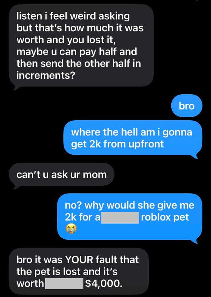 Now, it may seem a bit crazy that the situation has escalated from talking about a pixelated pet to demanding real money, but microtransactions in video games are more popular than ever, and yes, that includes kids’ games like Roblox. The game has its own virtual currency, Robux, but in order to get more of it, players have to spend real money.