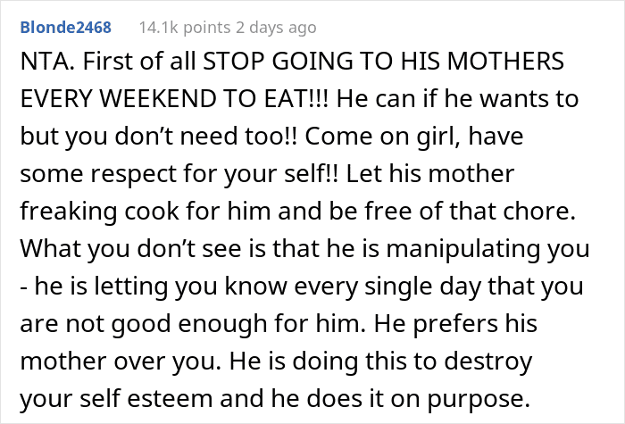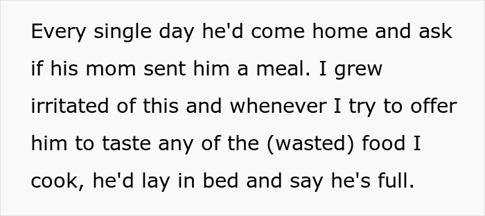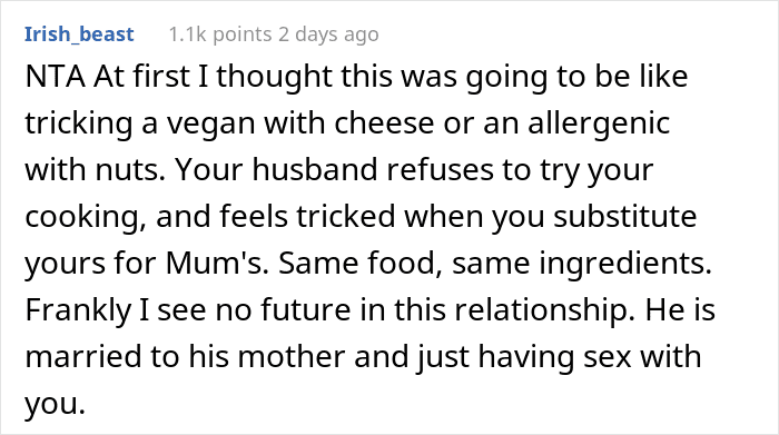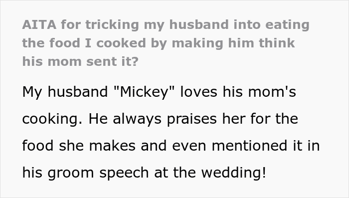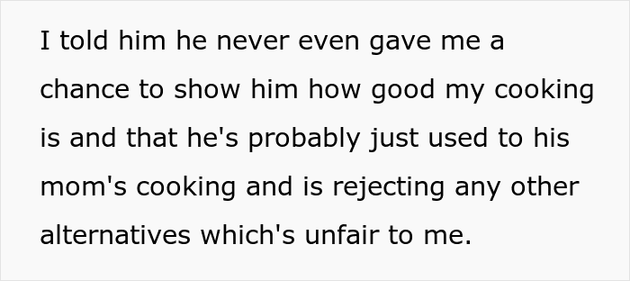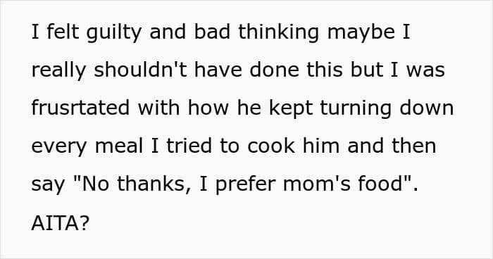 As the woman detailed in her AITA confession, her husband only eats his mom’s cooking and keeps turning down every meal she tries to prepare for him: “No thanks, I prefer mom’s food”. Feeling frustrated with this behavior, she decided to trick him into trying out her own version of the meal. But guess if the man was happy? Scroll down to read the full story and the responses where readers determine if she did anything wrong. Then be sure to let us know what you think of the whole ordeal in the comments!