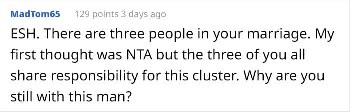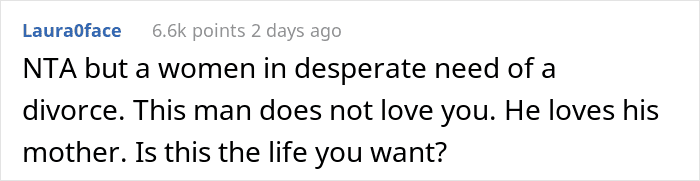 After reading the story, the members of the AITA community seemed to have more questions than answers. Some expressed support for the woman and voiced concerns about her family dynamics. Most commenters considered the husband as a mama’s boy who seems to place his relationship with his mother ahead of his wife. Other users determined that both parties were at fault and that everyone needed to share responsibility for the situation.