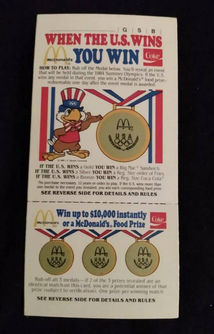 * When McDonald’s in the US did that scratchcard deal where they would give you a scratchcard which had an olympic event in it, and if the US won (medal? Gold? I don’t remember) they would give you a free burger or something. Of course, they calculated it so that most of the events would be ones usually won by Soviets. Guess who boycotted the olympics that year… Brilliantly parodied by the Simpsons.